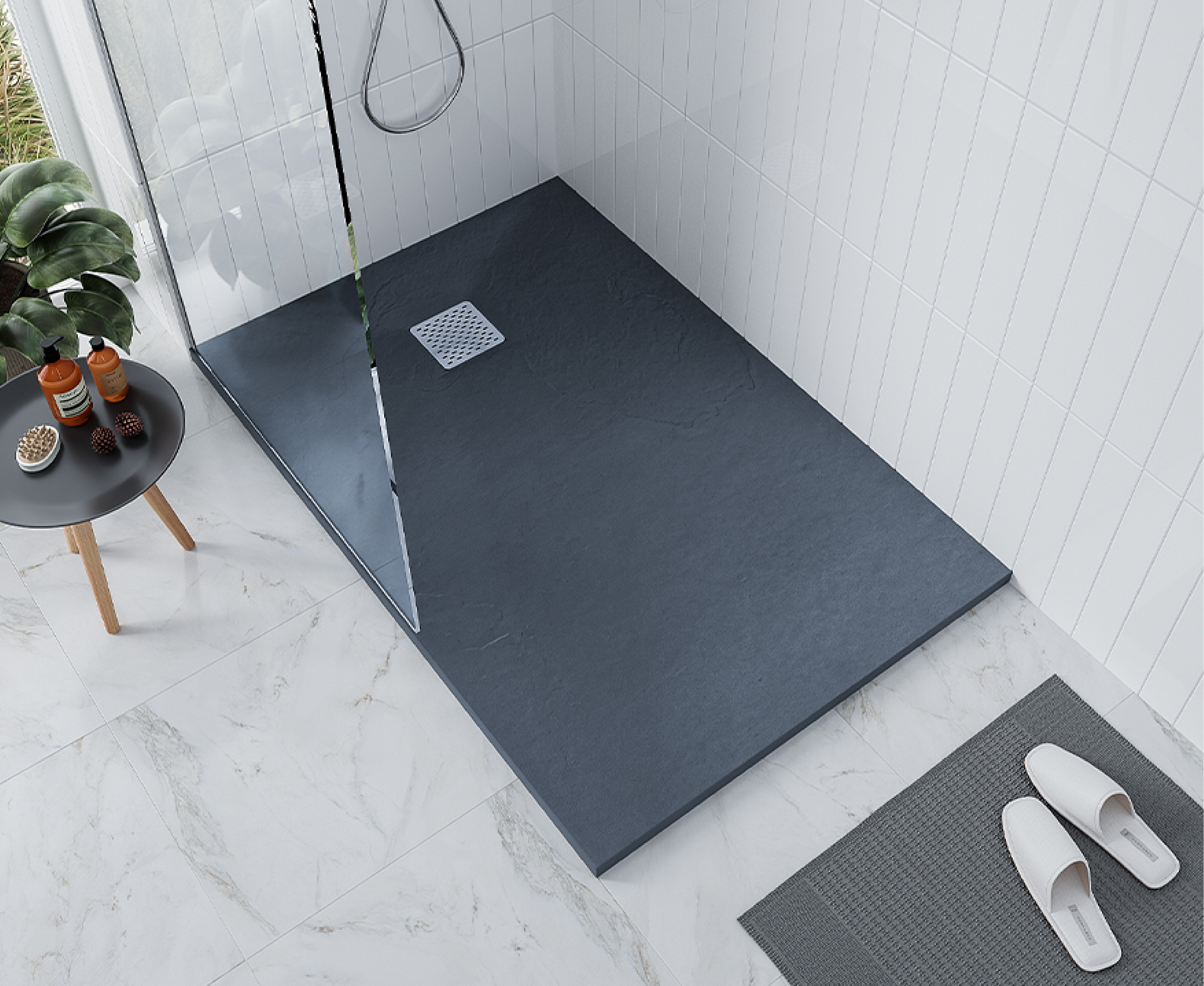Поддон из литьевого мрамора сочетает в себе элегантность и комфорт. Текстура поддона имитирует натуральный камень сланец. Легко подойдет к любому пространству ванной комнаты и дизайну за счет внешнего вида и цвета, делая ванные комнаты более просторными и минималистичными.